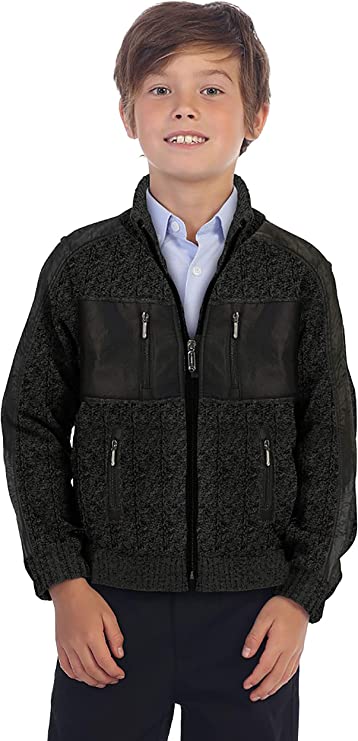 Full Zip Cardigan Patch Design Sweater with Brushed Flannel Lining - Charcoal